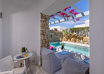 החדר מבטיח לאורחיו חוויה של נוחות ונוף ים מרהיב. החדר כולל מיטה זוגית או שתי מיטות טווין, פינת ישיבה, חדר רחצה יפייפה משיש עם מקלחון ואמבט עומד. מרפסת החדר משקיפה אל נוף חלקי לים והבריכה פרטית מזמינה אתכם לטבילה מרעננת. שילוב מושלם בין אלגנטיות, פרטיות ואווירה חלומית של חופשה.