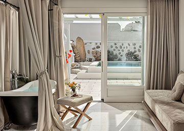 החדר מזמין אותכם להתפנק ביוקרה עם נוף עוצר נשימה לים ובריכה פרטית לחוויית חופשה אקסקלוסיבית ושלווה. החדר כולל מיטה זוגית או שתי מיטות טווין, פינת ישיבה וחדר רחצה יפייפה משייש עם מקלחון ואמבט עומד. במרפסת החדר מחכה לכם בריכה פרטית המזמינה אתכם לטבילה מרעננת מול הנוף הנהדר של הים.