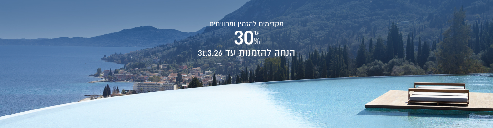 ✦ הזמינו עכשיו חופשה לאביב-קיץ 26' וקבלו עד 30% הנחה! תקף להזמנות שיבוצעו עד 31.03.26 ✦ מחירי החבילות שאנו מציעים כוללים בתוכם את הטבת הרישום המוקדם של בית המלון (ההנחה מגולמת במחיר). שיעור ההנחה משתנה בהתאם לתקופת השהייה וסוג החדר.