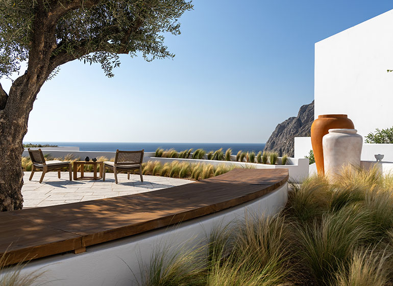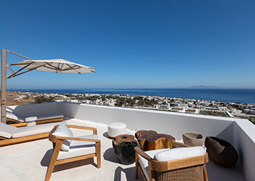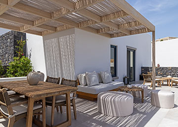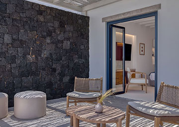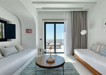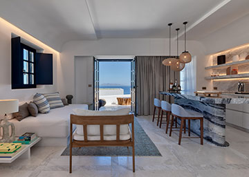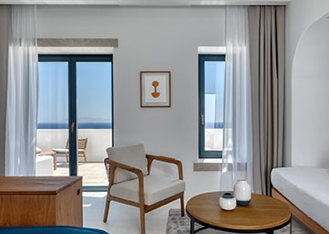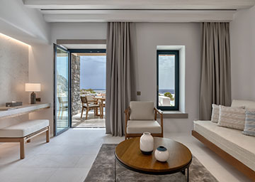 סוויטה יקרתית ומעוצבת בקפידה הכוללת חדר שינה עם מיטת קינג סייז, סלון עם שתי ספות היכולות לשמש כמיטות נוספות וחדר רחצה אלגנטי עם מקלחון. לסוויטה מרפסת מרוהטת המזמינה אתכם להשקיף אל נופי הריזורט ולחוות את הקסם האותנטי של סנטוריני.