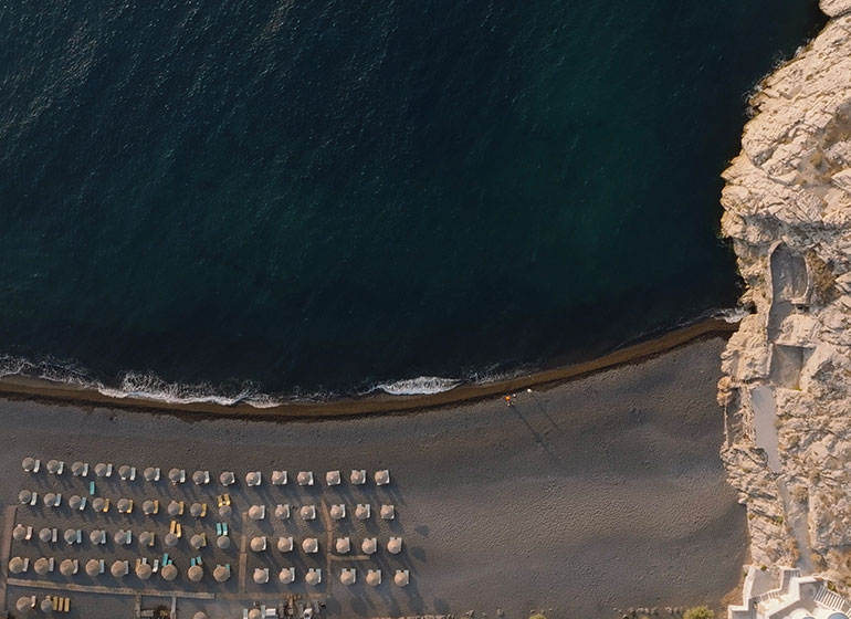 במרחק הליכה רגועה של כ־10 דקות, או נסיעה של כ־5 דקות עם שירותי הסעה זמינים לאורך היום, ניתן להגיע אזור החוף הבלעדי של Sandblu, על חוף החול השחור והייחודי של סנטוריני. בחוף מחכות לכם מיטות שיזוף על קו המים ומגבות רכות וכל פרט קטן זוכה לטיפול מוקפד על ידי שירות מארחות קשוב ומסור.