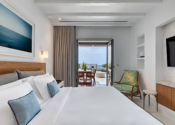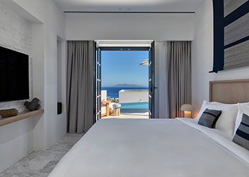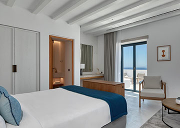 חדר אלגנטי ומרהיב, המציע נוף ים פתוח ועוצר נשימה. החדר, המעוצב בחלל פתוח כולל מיטת קינג סייז, פינת ישיבה עם ספה היכולה לשמש כמיטה נוספת וחדר רחצה אלגנטי עם מקלחון. לחדר מרפסת מרוהטת המזמינה אתכם לנוח ולהירגע מול נוף נהדר של הים.