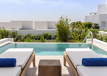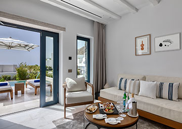 סוויטה שלווה ומעודנת, המשלבת אלגנטיות ונינוחות לחופשה בלתי נשכחת. הסוויטה מעוצבת בקפידה ומציעה נוחות וסטייל. היא כוללת חדר שינה עם מיטת קינג סייז, סלון ובו שתי ספות היכולות לשמש כמיטות נוספות וחדר רחצה מרשים עם מקלחון. לסוויטה מרפסת מרוהטת עם בריכה פרטית המזמינה אתכם ליהנות מרגעים בלתי נשכחים תחת השמש המלטפת.