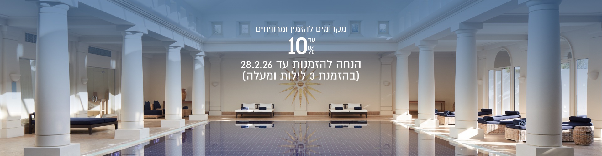 ✦ הזמינו עכשיו חופשה לאביב-קיץ 26' וקבלו עד 10% הנחה! תקף להזמנות שיבוצעו עד 28.02.26 ✦ מחירי החבילות כוללים בתוכם את הטבת הרישום המוקדם של בית המלון (ההנחה מגולמת במחיר). שיעור ההנחה משתנה בהתאם לתקופת השהייה וסוג החדר. תקף לשהייה של 3 לילות ומעלה.
