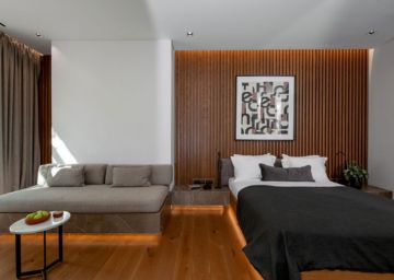 חדר המעוצב בסגנון עכשווי ומתוחכם מבלי לוותר על נוחות, עם צבעי אדמה נייטרליים ודגשים מעץ. החדר מציע מיטה זוגית, שולחן עבודה וחדר רחצה אלגנטי ומרווח עם מקלחון ראש גשם.
