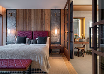חדר מעוצב בקווים נקיים וחומרים איכותיים היוצר שילוב של יוקרה מודרנית וקסם אלפיני מסורתי.