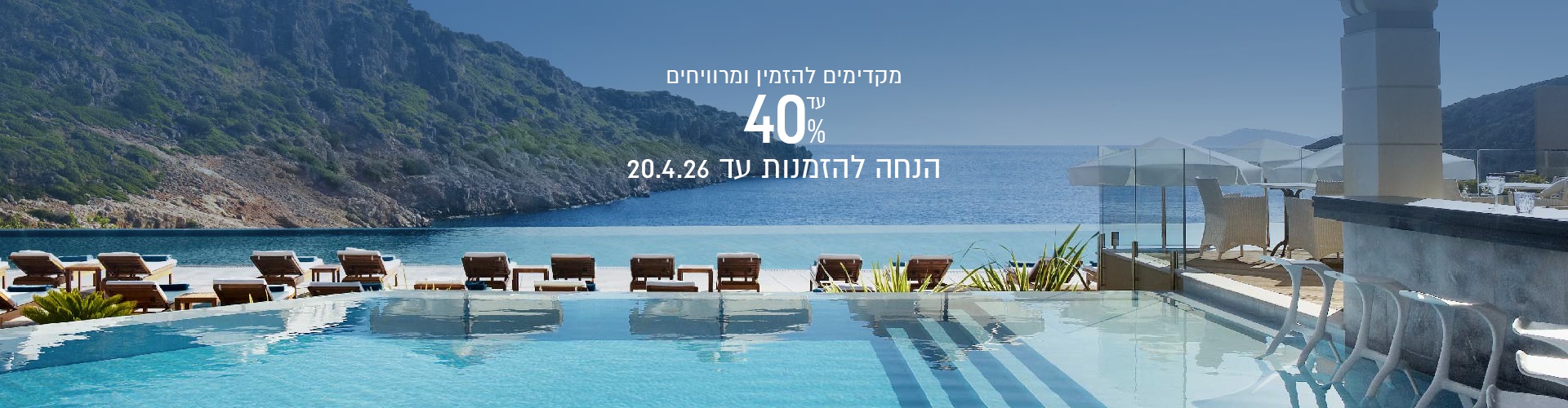 ✦ הזמינו עכשיו חופשה לאביב-קיץ 26' וקבלו 40% הנחה! תקף להזמנות שיבוצעו עד 20.4.26 ✦ מחירי החבילות שאנו מציעים כוללים בתוכם את הטבת הרישום המוקדם של בית המלון (ההנחה מגולמת במחיר). לפרטים מלאים ולהתאמה אישית, צוות מחלקת ההזמנות ישמח לעמוד לרשותכם.
