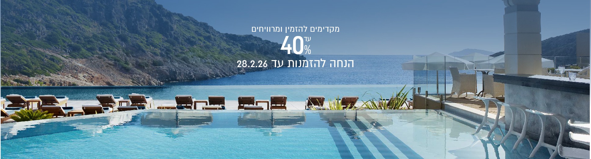 ✦ הזמינו עכשיו חופשה לאביב-קיץ 26' וקבלו 40% הנחה! תקף להזמנות שיבוצעו עד 31.01.26 ✦ מחירי החבילות שאנו מציעים כוללים בתוכם את הטבת הרישום המוקדם של בית המלון (ההנחה מגולמת במחיר). לפרטים מלאים ולהתאמה אישית, צוות מחלקת ההזמנות ישמח לעמוד לרשותכם.