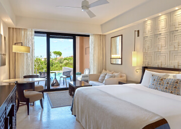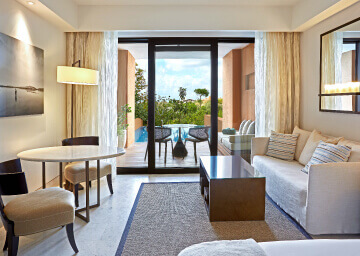 סוויטה מפנקת ומרווחת המעוצבת בסגנון עכשווי עם עץ כהה, גוונים בהירים ונגיעות של צבע שתעניק לכם חופשה בלתי נשכחת בין גני הריזורט הירוקים. הסוויטה כוללת חדר שינה עם מיטת קינג סייז מפנקת, סלון נפרד להענקת פרטיות מירבית, פינת אוכל, חדר רחצה מרווח ואלגנטי עם אמבטיית זרמים ומקלחון נפרדים ומרפסת מרוהטת ומרווחת עם בריכת אינפיניטי פרטית (כ- 23 מ"ר) ממנה נפרש נוף עוצר נשימה של מטעי זית והגנים העשירים של הריזורט, של מגרשי הגולף או של הים. אורחי הסוויטה יהנו משירות של באטלר אישי.