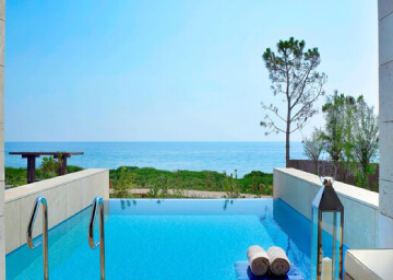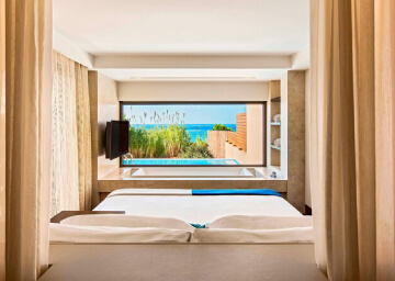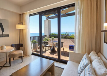 סוויטה מפנקת ומרווחת המעוצבת בסגנון עכשווי עם עץ כהה, גוונים בהירים ונגיעות של צבע שתעניק לכם חופשה בלתי נשכחת בין גני הריזורט הירוקים. הסוויטה כוללת חדר שינה עם מיטת קינג סייז מפנקת, סלון נפרד להענקת פרטיות מירבית, פינת אוכל, חדר רחצה מרווח ואלגנטי עם אמבטיית זרמים ומקלחון נפרדים ומרפסת מרוהטת ומרווחת עם בריכת אינפיניטי פרטית (כ- 23 מ"ר) ממנה נפרש נוף עוצר נשימה של הים הכחול האינסופי. אורחי הסוויטה יהנו משירות של באטלר אישי.