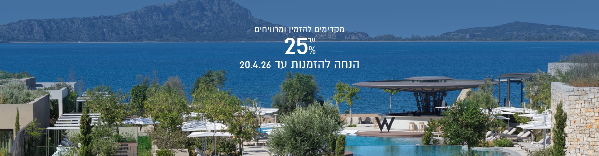 ✦ הזמינו עכשיו חופשה לאביב-קיץ 26' וקבלו עד 25% הנחה! תקף להזמנות שיבוצעו עד 20.4.26 ✦ מחירי החבילות שאנו מציעים כוללים בתוכם את הטבת הרישום המוקדם של בית המלון (ההנחה מגולמת במחיר). שיעור ההנחה משתנה בהתאם לתקופת השהייה וסוג החדר.
