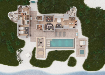 וילה חלומית, מודרנית ויוקרתית, מפלט טרופי על חוף חול לבן מוקף צמחיה, המציעה חדר שינה עם מיטת וולדורף אסטוריה הייחודית בגודל קינג סייז וחלונות מרצפה עד תקרה לנוף ללא הפרעה לאוקיינוס, חדר רחצה חיצוני ופנימי מפנק במיוחד עם אמבטיה גדולה ומקלחון נפרד, סלון עם פינת ישיבה, פינת אוכל וטרסה נרחבת עם בריכת אינסוף פרטית, ביתן עם פינת אוכל, מיטות יום, ערסל וגישה ישירה לחוף הים.
