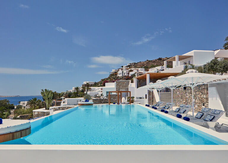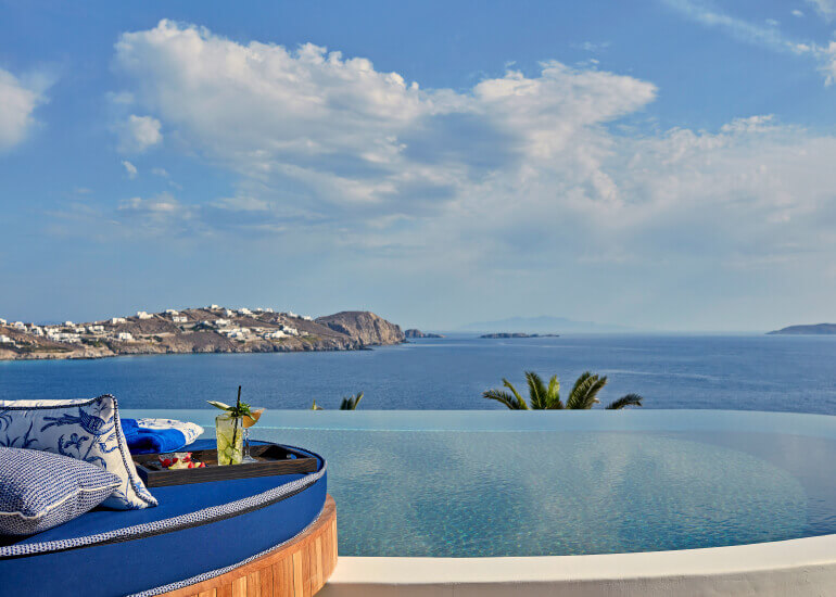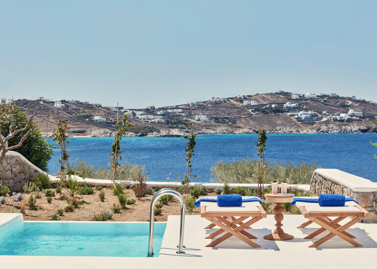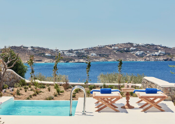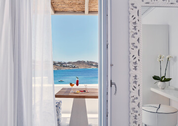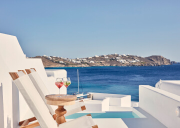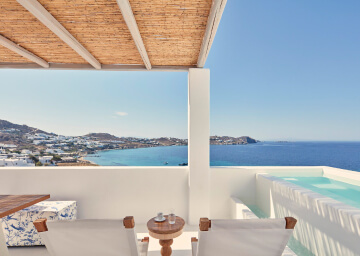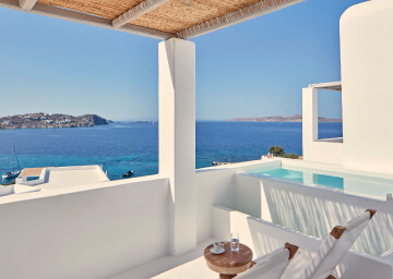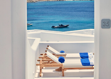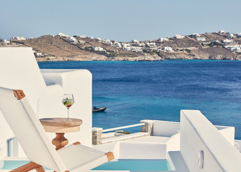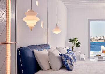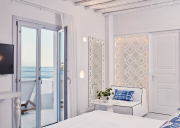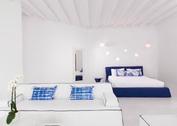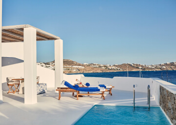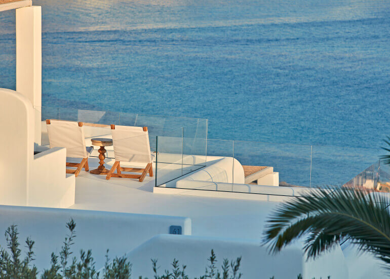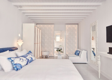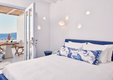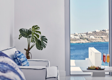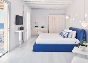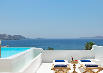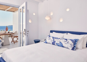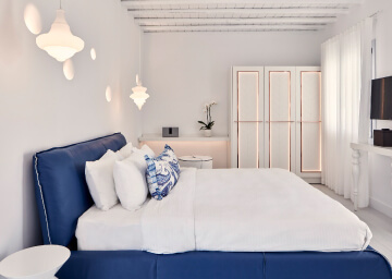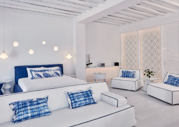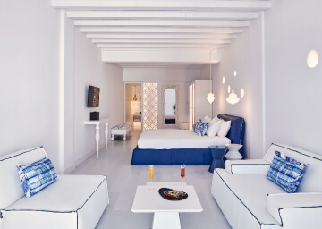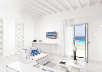 סוויטות הסופריות מעוצבות בגווני כחול לבן המזוהים עם מיקונוס, ומעניקות נוחות מקסימלית בשילוב של עיצוב פנים מודרני ואלגנטי, המבטיח חווית אירוח ברמה הגבוהה ביותר. הסוויטות כוללות טרסות פרטיות נדיבות בהן בריכה פרטית למול נופים עוצרי נשימה של הים האגאי להשלמת החוויה היוקרתית.
