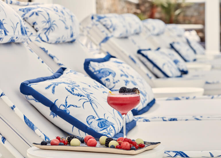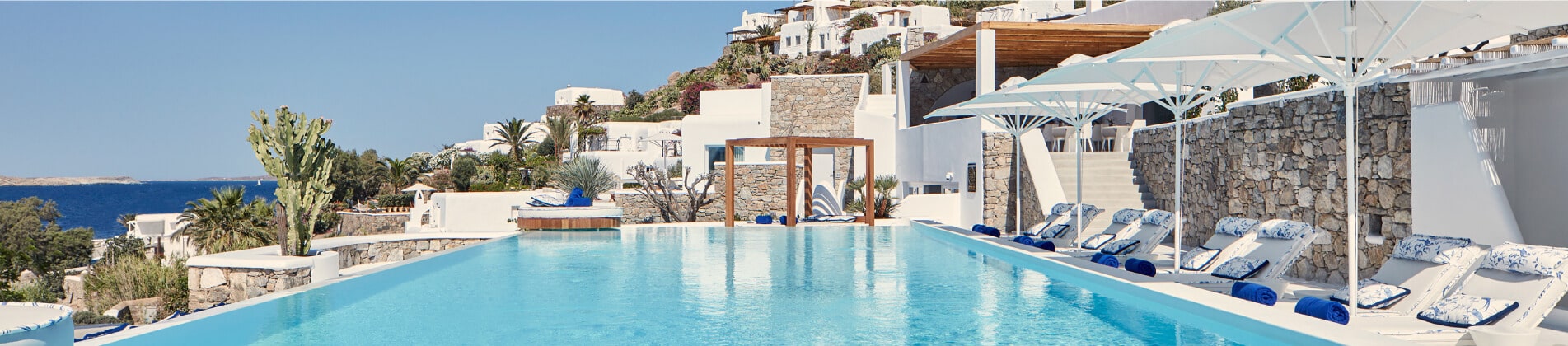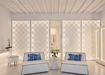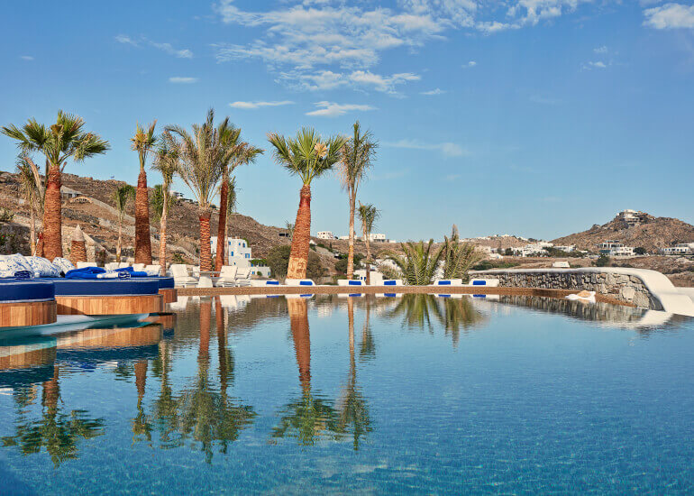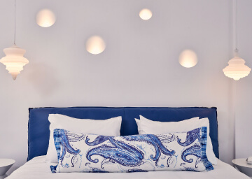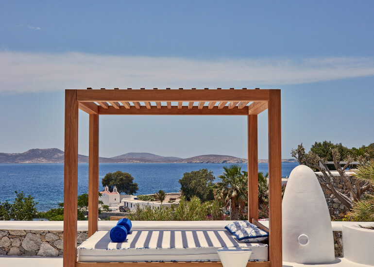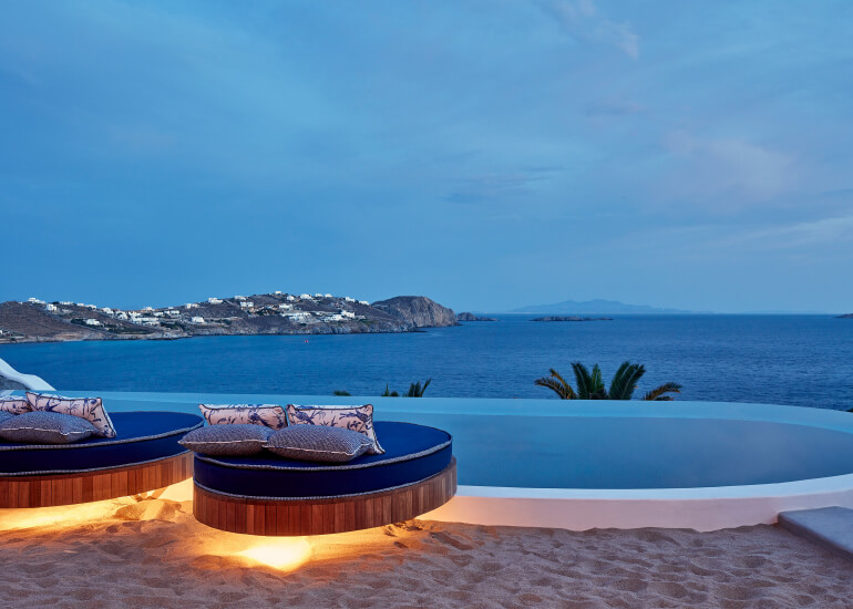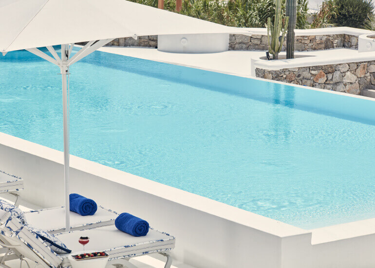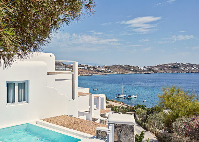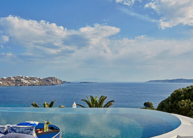 סוויטות הסופריות מעוצבות בגווני כחול לבן המזוהים עם מיקונוס, ומעניקות נוחות מקסימלית בשילוב של עיצוב פנים מודרני ואלגנטי, המבטיח חווית אירוח ברמה הגבוהה ביותר. הסוויטות כוללות טרסות פרטיות נדיבות בהן בריכה פרטית למול נופים עוצרי נשימה של הים האגאי להשלמת החוויה היוקרתית.
