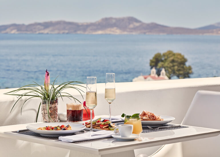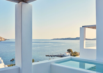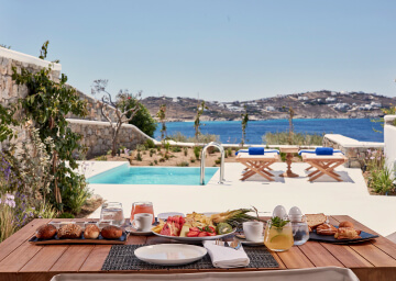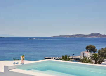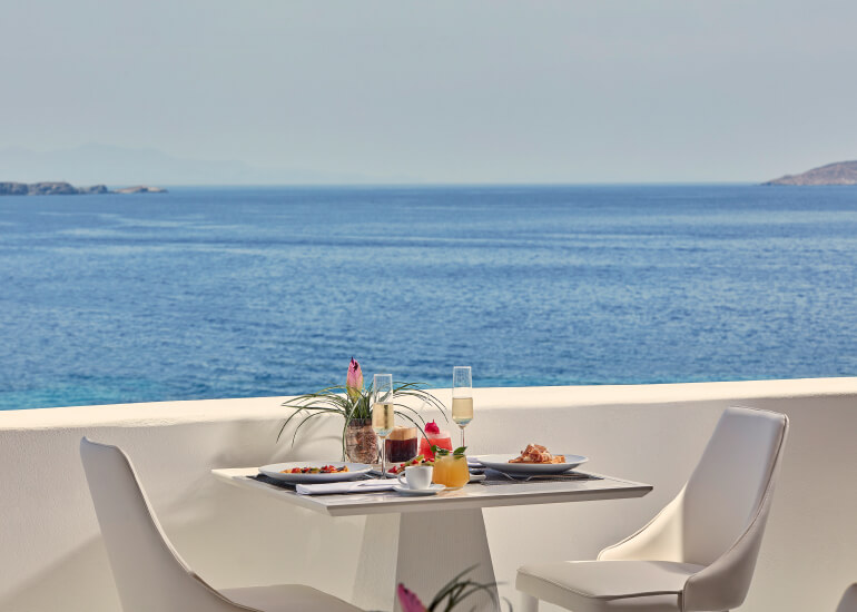סוויטות רומנטיות, יוקרתיות ואלגנטיות, נבנו במחשבה להעניק לזוגות בירח דבש את החופשה המושלמת, מעוצבות בגווני כחול לבן המזוהים עם מיקונוס, ומעניקות נוחות מקסימלית בשילוב חווית אירוח ברמה הגבוהה ביותר. הסוויטות כוללות טרסות פרטיות נדיבות בהן בריכה פרטית, מיטות שיזוף ופינת אוכל למול נופים עוצרי נשימה של הים האגאי להשלמת החוויה היוקרתית.