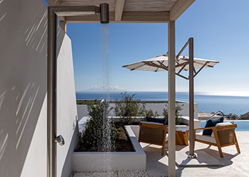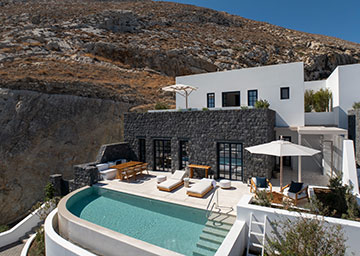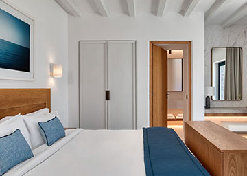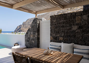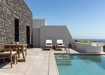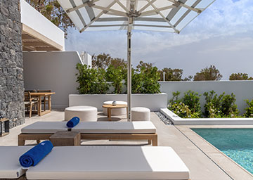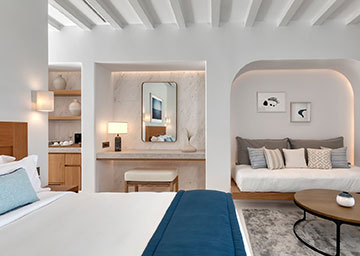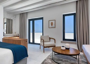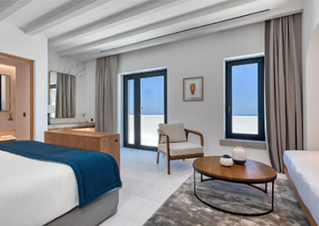 סוויטה יקרתית ומעוצבת בקפידה הכוללת חדר שינה עם מיטת קינג סייז, סלון עם שתי ספות היכולות לשמש כמיטות נוספות וחדר רחצה אלגנטי עם מקלחון. לסוויטה מרפסת מרוהטת המזמינה אתכם להשקיף אל נופי הריזורט ולחוות את הקסם האותנטי של סנטוריני.