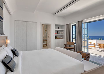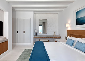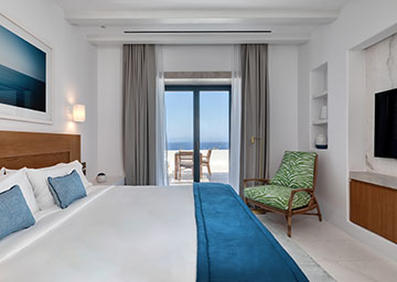 חדר אלגנטי ומרהיב, המציע נוף ים פתוח ועוצר נשימה. החדר, המעוצב בחלל פתוח כולל מיטת קינג סייז, פינת ישיבה עם ספה היכולה לשמש כמיטה נוספת וחדר רחצה אלגנטי עם מקלחון. לחדר מרפסת מרוהטת המזמינה אתכם לנוח ולהירגע מול נוף נהדר של הים.