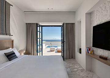 חדר המציע מפלט של אלגנטיות ושלווה, החדר מעוצב בטוב טעם ומבטיח חוויית אירוח בלתי נשכחת. החדר כולל מיטת קינג סייז, פינת ישיבה עם ספה היכולה לשמש כמיטה נוספת וחדר רחצה אלגנטי עם מקלחון. לחדר מרפסת מרוהטת עם בריכה פרטית המזמינה אתכם לטבילה מרעננת מול קרני השמש המלטפות.